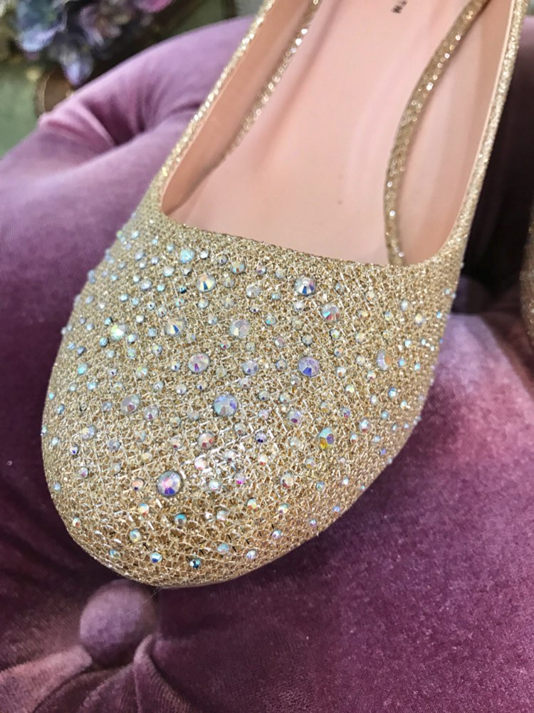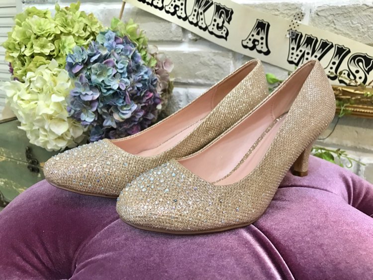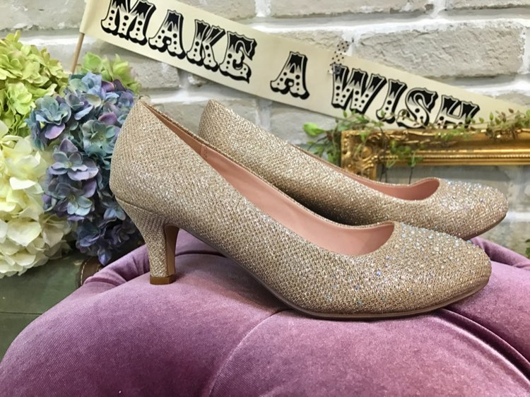 キラキラと華やかなゴールドのローヒールパンプス。7cm以上のヒールが苦手な方や、高さを出したくない高身長の方にも安心して履いていただける5.5cmヒール。安定感も◎です。高いヒールは避けたいけれど、お呼ばれなどのマナー上ペタンコを履くのも・・・という場合に重宝します。ラメの煌めきが華やかな生地のつま先にはオーロラカラーのラインストーンをちりばめた、結婚式やパーティーなどの特別な日にぴったりの贅沢なデザインで、幅広いドレスとコーディネート可能なお色味です。