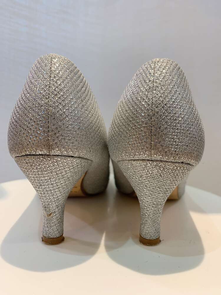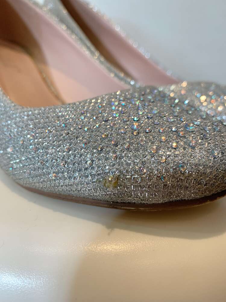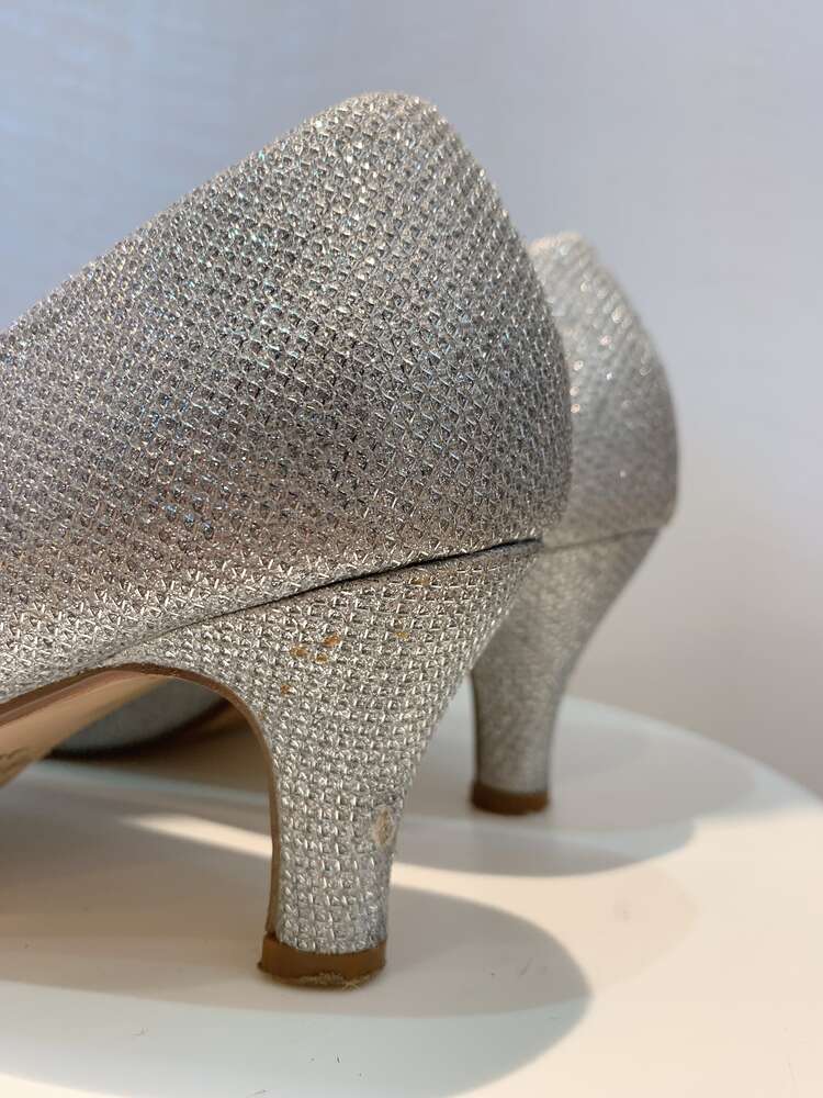 キラキラと華やかなシルバーのローヒールパンプス。7cm以上のヒールが苦手な方や、高さを出したくない高身長の方にも安心して履いていただける5.5cmヒール。安定感も◎です。マタニティや高身長で高さを出したくない新婦様の1.5次会、2次会用のウエディングシューズとしてはもちろん、高いヒールは避けたいけれど、お呼ばれなどのマナー上ペタンコを履くのも・・・という場合に重宝します。ラメの煌めきが華やかな生地のつま先にはオーロラカラーのラインストーンをちりばめた、結婚式やパーティーなどの特別な日にぴったりの贅沢なデザインで、幅広いドレスとコーディネート可能なお色味です。