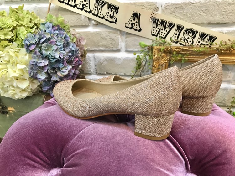 キラキラと華やかなゴールドのローヒールパンプス。5cm以上のヒールが苦手な方や妊婦さんにも安心して履いていただける太めの4cmヒール。履いた感じは限りなくフラットに近い感覚で安定感抜群。高いヒールは避けたいけれど、お呼ばれなどのマナー上ペタンコを履くのも・・・という場合に重宝するアイテムです。ラメの煌めきが華やかな生地のつま先には同系色のラインストーンをちりばめた、結婚式やパーティーなどの特別な日にぴったりの贅沢なデザインで、幅広いドレスとコーディネート可能なお色味です。
