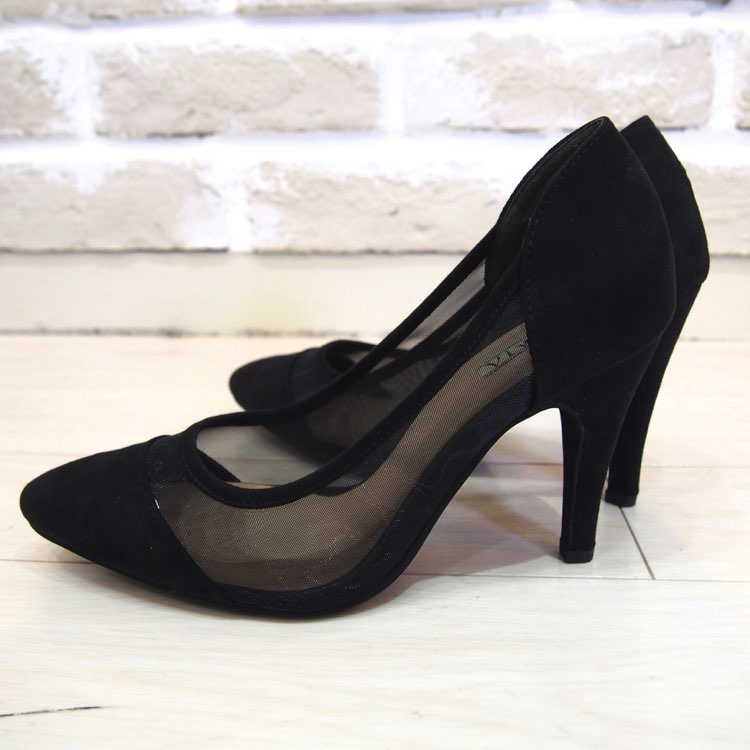 プレーンで落ち着いた雰囲気の使いやすいブラックカラーのパンプス。フェイクスエードとメッシュ素材のコンビネーションで重さと軽さのバランスがちょうどいいアイテムです。シンプルなデザインであらゆるタイプのドレスに合わせやすく、明るく優しいカラーのドレスの締め色や大人っぽくかっこいいドレスをさらにかっこよく仕上げるアイテムとして、結婚式のお呼ばれや同窓会や謝恩会など、靴選びに迷った際にはチャレンジしやすい一足。普段使いもし易いフェイクスエードの生地は、お手持ちのお洋服や普段着ないようなドレスまで、オンオフあらゆるシーンに合わせてお使いいただけますよ。