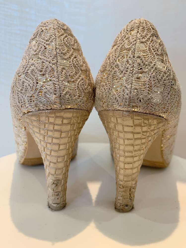 丸みのあるフォルムがフェミニンで使いやすいベージュカラーのパンプス。レース生地の間にびっしりと埋め込まれたホログラムがキラキラと煌めき、普段よりも特別感のあるスタイリングへとブラッシュアップさせてくれます。シンプルなデザインであらゆるタイプのドレスに合わせやすく、重厚感を感じる厚手の生地と程よいボリュームは足元だけでなくコーディネート全体にメリハリを与え引き締めて見せてくれます。明るく優しいカラーのドレスや大人っぽくかっこいいドレスに華を添えるアイテムとして、結婚式のお呼ばれから同窓会や謝恩会まで、靴選びに迷った際にはチャレンジしやすい一足です。