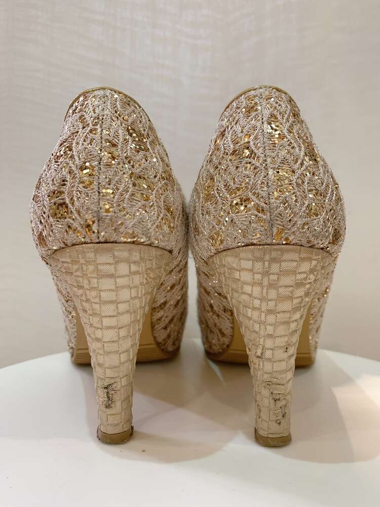 丸みのあるフォルムがフェミニンで使いやすいベージュカラーのパンプス。レース生地の間にびっしりと埋め込まれたホログラムがキラキラと煌めき、普段よりも特別感のあるスタイリングへとブラッシュアップさせてくれます。シンプルなデザインであらゆるタイプのドレスに合わせやすく、重厚感を感じる厚手の生地と程よいボリュームは足元だけでなくコーディネート全体にメリハリを与え引き締めて見せてくれます。明るく優しいカラーのドレスや大人っぽくかっこいいドレスに華を添えるアイテムとして、結婚式のお呼ばれから同窓会や謝恩会まで、靴選びに迷った際にはチャレンジしやすい一足です。