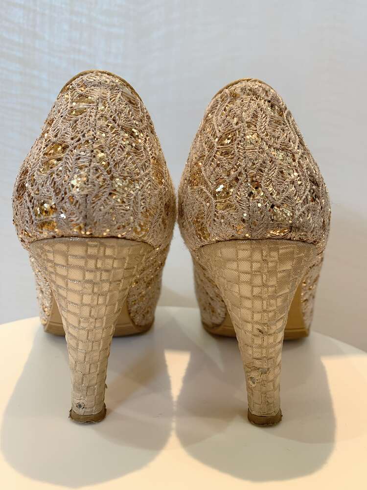 丸みのあるフォルムがフェミニンで使いやすいベージュカラーのパンプス。レース生地の間にびっしりと埋め込まれたホログラムがキラキラと煌めき、普段よりも特別感のあるスタイリングへとブラッシュアップさせてくれます。シンプルなデザインであらゆるタイプのドレスに合わせやすく、重厚感を感じる厚手の生地と程よいボリュームは足元だけでなくコーディネート全体にメリハリを与え引き締めて見せてくれます。明るく優しいカラーのドレスや大人っぽくかっこいいドレスに華を添えるアイテムとして、結婚式のお呼ばれから同窓会や謝恩会まで、靴選びに迷った際にはチャレンジしやすい一足です。