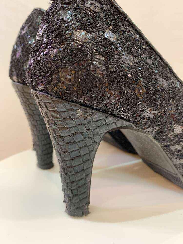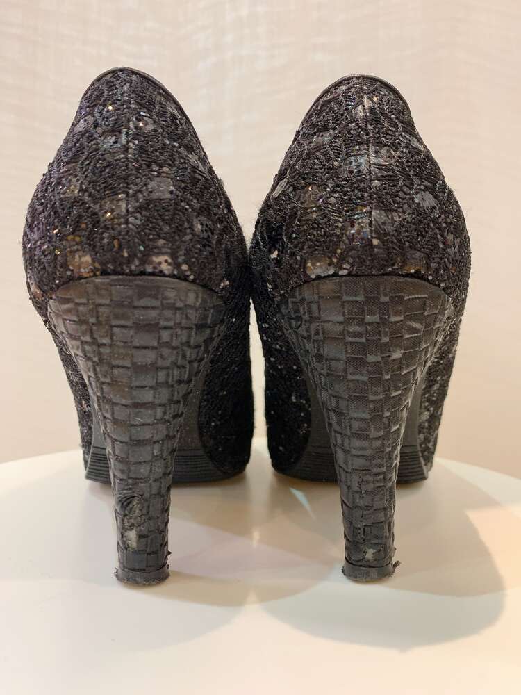 丸みのあるフォルムがフェミニンで使いやすいブラックカラーのパンプス。レース生地の間にびっしりと埋め込まれたホログラムがキラキラと煌めき、普段よりも特別感のあるスタイリングへとブラッシュアップさせてくれます。シンプルなデザインであらゆるタイプのドレスに合わせやすく、重厚感を感じる厚手の生地と程よいボリュームは足元だけでなくコーディネート全体にメリハリを与え引き締めて見せてくれます。明るく優しいカラーのドレスの締め色や大人っぽくかっこいいドレスをさらにかっこよく仕上げるアイテムとして、結婚式のお呼ばれから同窓会や謝恩会まで、靴選びに迷った際にはチャレンジしやすい一足です。