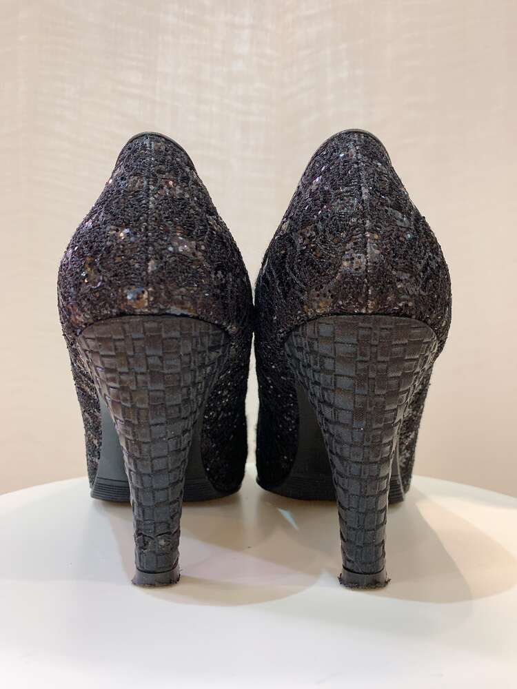 丸みのあるフォルムがフェミニンで使いやすいブラックカラーのパンプス。レース生地の間にびっしりと埋め込まれたホログラムがキラキラと煌めき、普段よりも特別感のあるスタイリングへとブラッシュアップさせてくれます。シンプルなデザインであらゆるタイプのドレスに合わせやすく、重厚感を感じる厚手の生地と程よいボリュームは足元だけでなくコーディネート全体にメリハリを与え引き締めて見せてくれます。明るく優しいカラーのドレスの締め色や大人っぽくかっこいいドレスをさらにかっこよく仕上げるアイテムとして、結婚式のお呼ばれから同窓会や謝恩会まで、靴選びに迷った際にはチャレンジしやすい一足です。