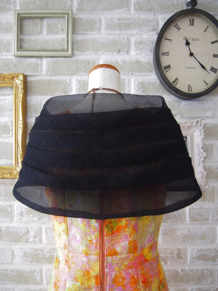 黒が際立つシンプルなショール。前のホックを留めて肩を覆うタイプ。気品漂うフォーマルブラックは、演奏会やよりフォーマルな雰囲気の強いパーティーなどでの華やかでありながら格式ある雰囲気のコーディネートにおすすめです。合わせるドレスもしっかりと華やかなものが◎。ショートやミディアム丈だけでなくスレンダーなロングドレスに合わせても、クラシックでラグジュアリーなドレスアップスタイルをお楽しみいただけます。