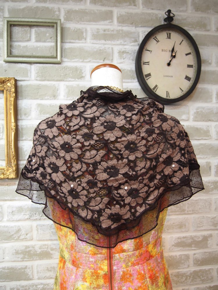 前で結びやすい三角ストール。レース生地に点々とパールをちりばめ、端にはチュールを配した、優しく可愛らしいデザイン。色味は甘くなりすぎず使いやすいブラウンです。シンプルなものや甘い雰囲気のドレスにおすすめ。また、長さがないので小柄な方にもバランスよくご利用いただけます。バックスタイルまでぬかりなく可愛い贅沢なアイテムですね。結婚式お呼ばれにはもちろん、同窓会などにもぴったりです。