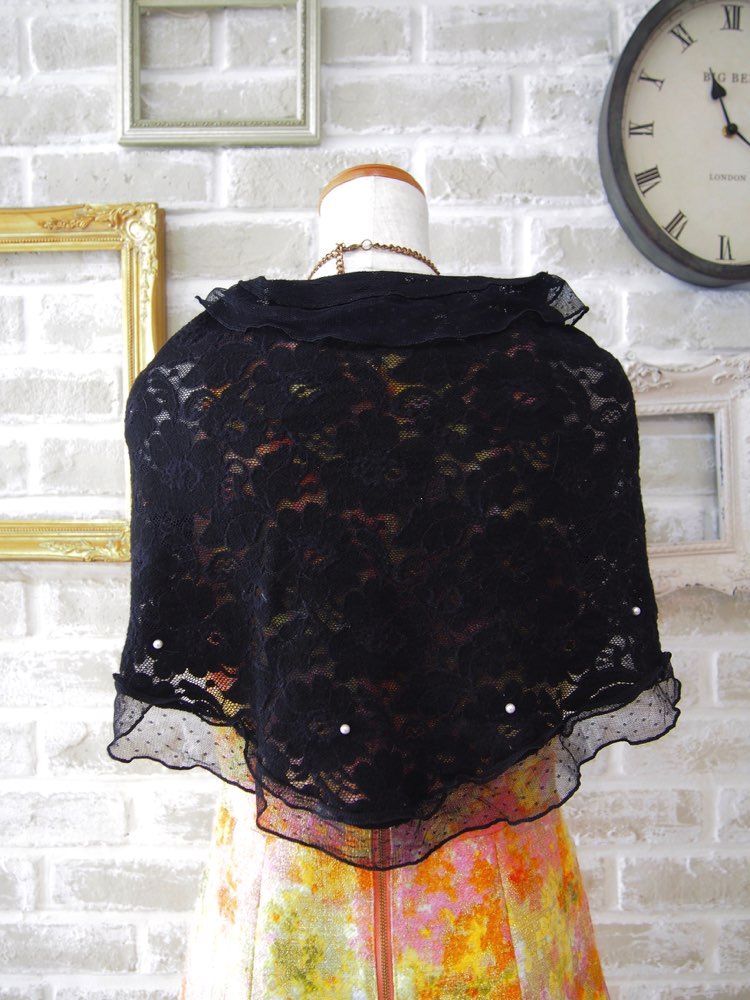 前で結びやすい三角ストール。レース生地に点々とパールをちりばめ、端にはチュールを配した、優しく可愛らしいデザイン。色味は甘くなりすぎず使いやすいブラックです。シンプルなものや甘い雰囲気のドレスにおすすめ。また、長さがないので小柄な方にもバランスよくご利用いただけます。バックスタイルまでぬかりなく可愛い贅沢なアイテムですね。結婚式お呼ばれにはもちろん、同窓会などにもぴったりです。