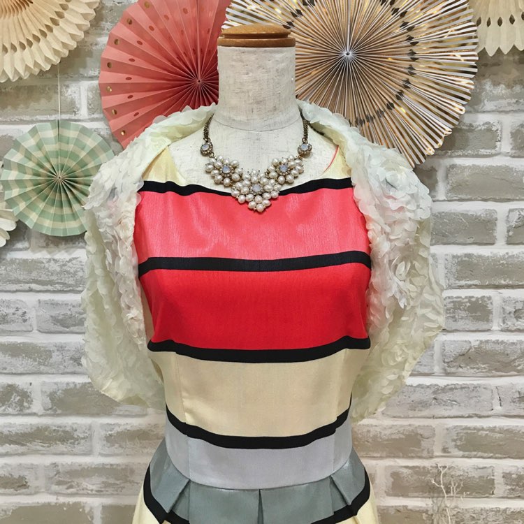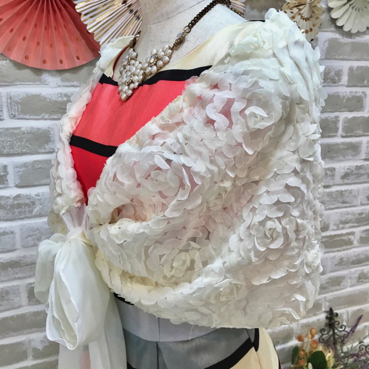 オフホワイトのフラワーフリルを施したショール。背中側で結ぶとボレロ風の着こなしもできます。全体のフリルと前で結ぶとできる大きなリボンが相まって、甘く優しい雰囲気で可愛らしさ際立つデザインとなっております。結婚式お呼ばれや謝恩会などのパーティーではガーリーなドレスに合わせたコーディネートがおすすめ。また、オフホワイトなので新婦様の2次会ドレス用の羽織としてもお使いいただけます。