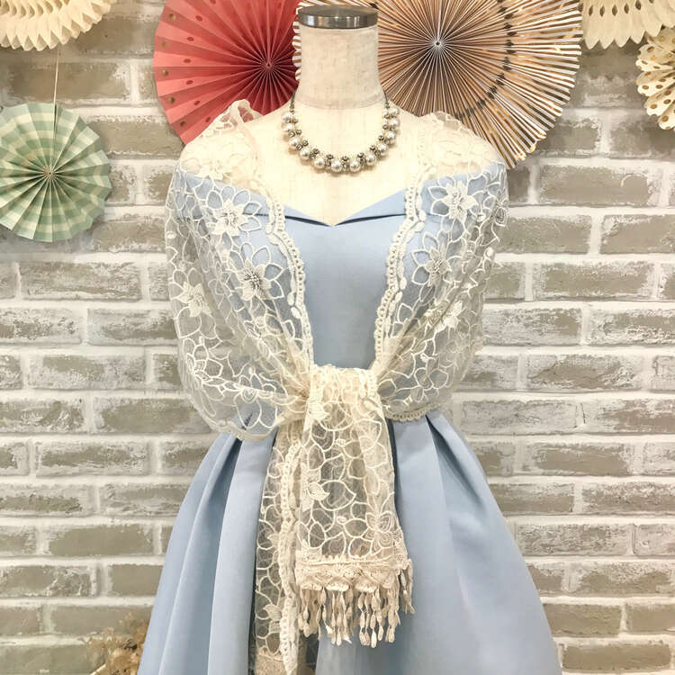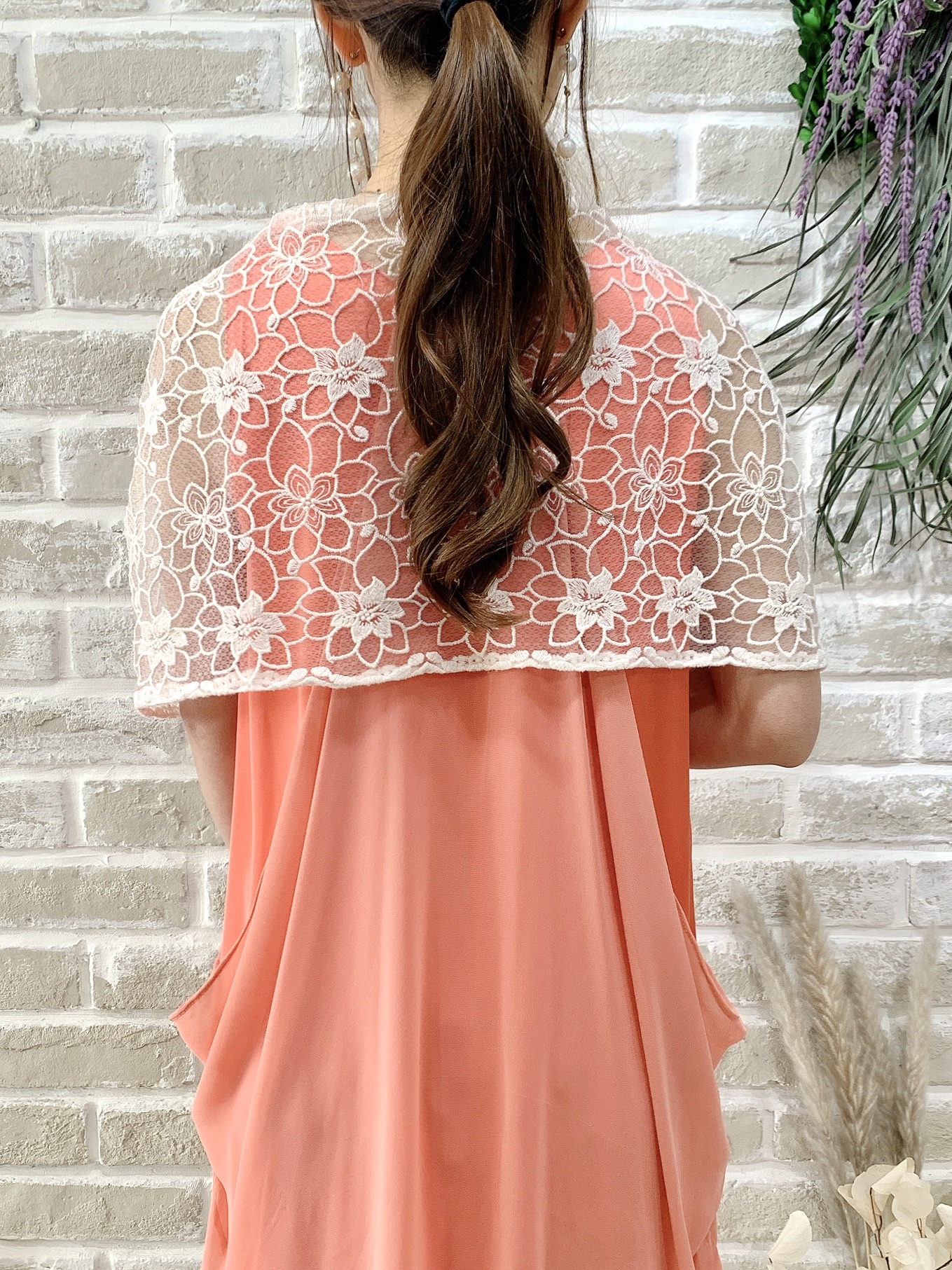 アイボリーの刺繍ストール。大柄のフラワー刺繍が華やかで、優しく可愛らしい雰囲気。透け感があるので重たく見えることもなく、袖なしのドレスだけでなく短い袖があるけど羽織が欲しいなという場合の、’’一応羽織を持っておきたい’’場合にもお使いいただけます。結婚式のお呼ばれはもちろん、謝恩会や同窓会、花嫁さんの2次会のナチュラルテイストのドレスに合わせる羽織としてもおすすめです。