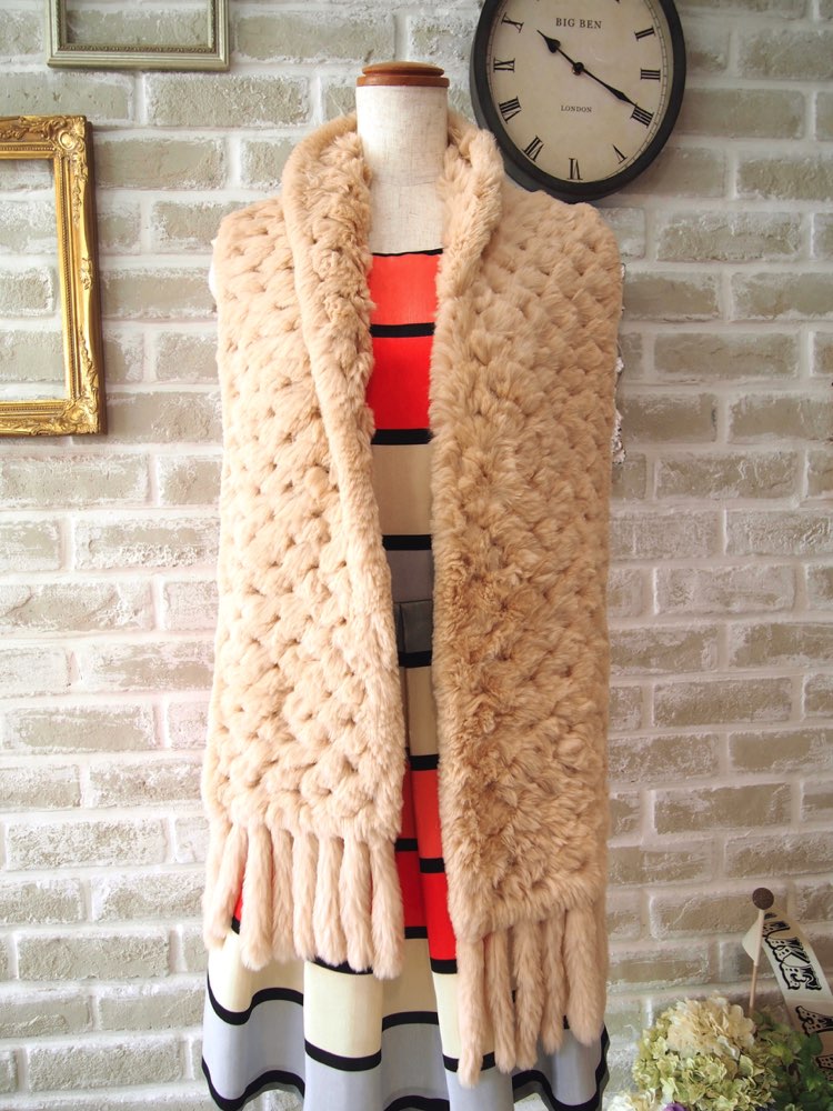 少しピンクがかったベージュのラビットファーマフラー。ラビットファー特有のふわふわ感は可愛らしさだけでなく、肌触りも抜群です。パーティーやデートシーンなど、冬の華やかなドレスアップスタイルでのお出かけのお供に。コートなどの上からお使いいただけます。羽織がいらないドレスの移動用に組み合わせていただくとバランス◎。