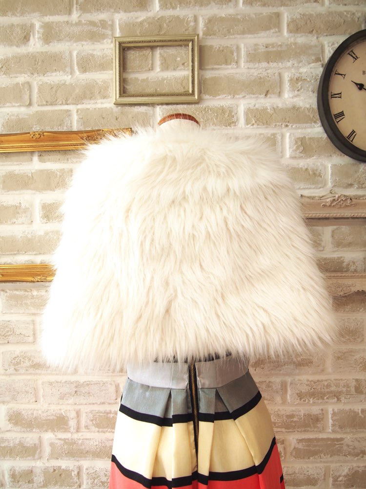 真っさらなホワイトカラーのフェイクファーケープ。フロントにホックがついており、手が空くので動きやすさもありますよ。深みのあるカラーと合わせて大人っぽくはもちろん、アイボリーやペールトーンのドレスとの組み合わせもすごく可愛くておすすめです。ボリュームがありラグジュアリーな雰囲気で、可愛らしいドレスには大人っぽさを、かっこいいドレスには柔らかさを与えてくれる万能アイテムです。成人式のお着物や、新婦様のドレスの羽織にも。