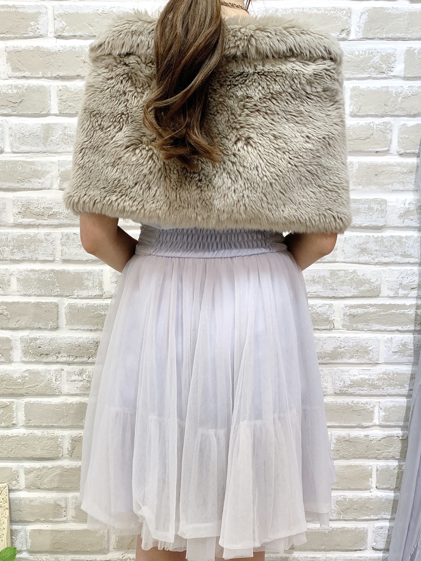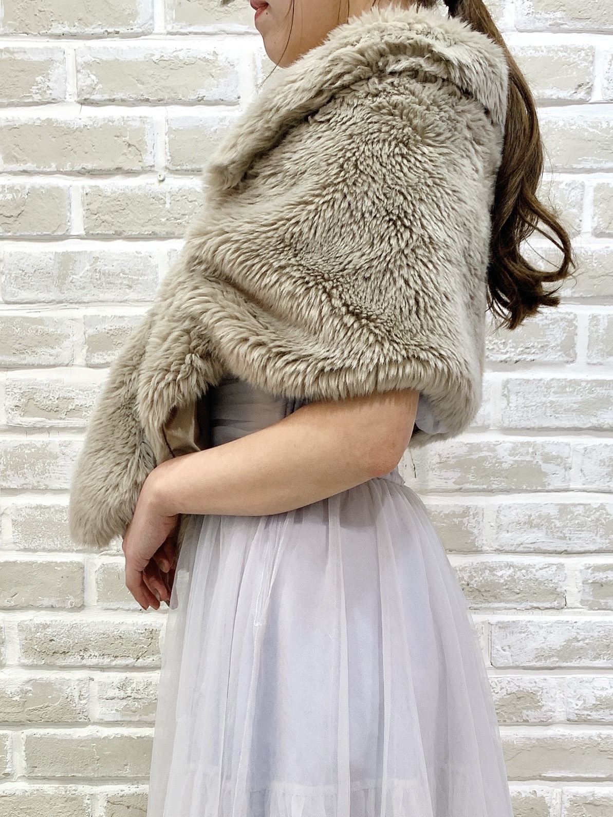 くすみのあるグレージュカラーがおしゃれなフェイクファーケープ。フロントにホックがついており、手が空くので動きやすさもありますよ。深みのあるカラーと合わせて大人っぽくはもちろん、アイボリーやオフホワイト、ペールトーンのドレスとの組み合わせもすごく可愛くておすすめです。くすんだカラーはそれだけでこなれ感が出てスタイリッシュに見えます。可愛らしいドレスには大人っぽさを、かっこいいドレスには柔らかさを与えてくれる万能アイテムです。