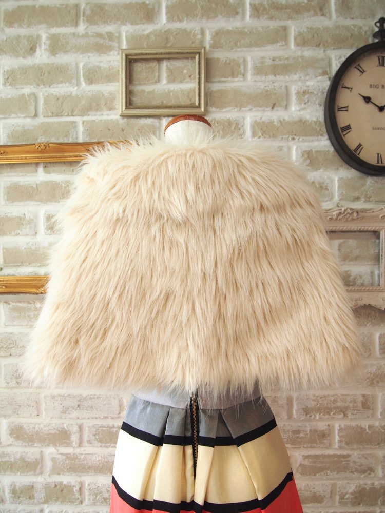 ナチュラルなアイボリーカラーがおしゃれなフェイクファーケープ。フロントにホックがついており、手が空くので動きやすさもありますよ。深みのあるカラーと合わせて大人っぽくはもちろん、アイボリーやペールトーンのドレスとの組み合わせもすごく可愛くておすすめです。ボリュームがありラグジュアリーな雰囲気で、可愛らしいドレスには大人っぽさを、かっこいいドレスには柔らかさを与えてくれる万能アイテムです。