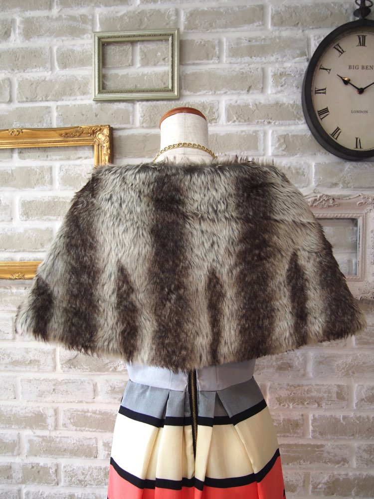 チャコール系のカラーのフェイファーケープ。存在感がありビターな雰囲気でコーディネートのアクセントとして活躍してくれます。リアルファーでは華やかさがありすぎる、もっと気軽にファーにチャレンジしてみたいという場合にもおすすめ。パーティーなどにスナップボタンが付いており、ケープのようにして着ることも可能です。華やかなドレスにゴージャスなテイストをプラスして、冬場のパーティーでワンランク上のドレスアップをお楽しみいただけます。