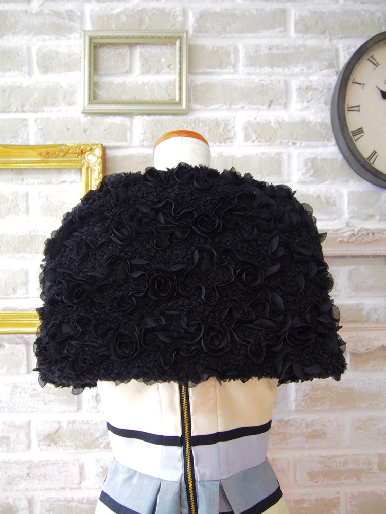 ブラックのボア生地にフラワーフリルを施したショール。背中側で結ぶとボレロ風の着こなしもできます。ボア生地なのでファーと違って毛飛びの心配が少なく、冬場のパーティーや謝恩会や成人式等幅広いシーンで使いやすいアイテムです。バラモチーフのフリルがびっしりで可愛らしさと華やかさをぎゅっと詰め込んだ贅沢なデザイン。シックで落ち着きのあるカラーなので可愛らしいドレスにはもちろん、大人っぽいドレスにも組み合わせていただけますよ。