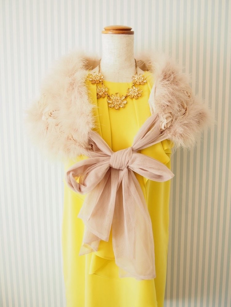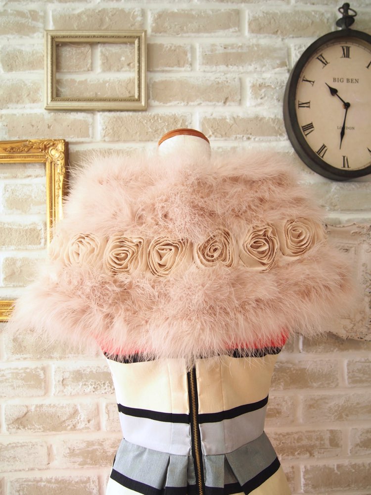 ピンクベージュのチュール生地にリアルフェザーをミックスしたショール。前で結ぶのはもちろん、背中側で結ぶとボレロ風の着こなしもできます。柔らかなピンクベージュカラーは落ち着きもあり、上品でフェミニンな雰囲気を与えてくれます。また、大きなお花のデザインも華やかさを盛り上げます。冬場のパーティーなど、華やかなドレスアップスタイルでのお出かけのお供に。