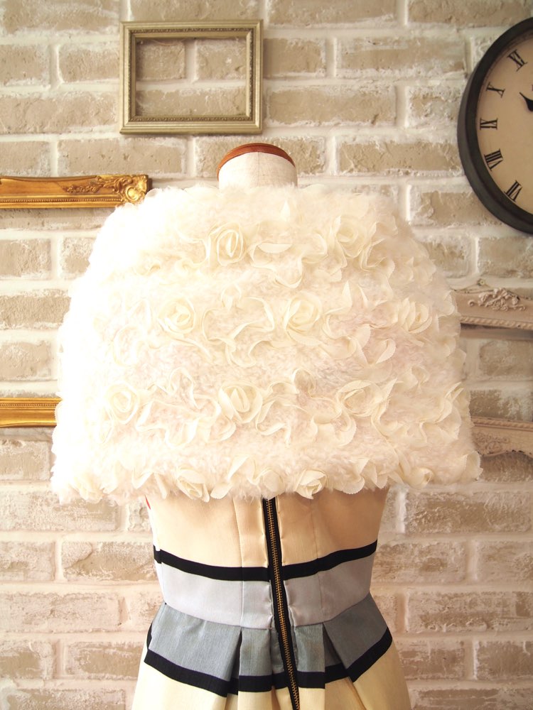 オフホワイトのボア生地にフラワーフリルを施したショール。背中側で結ぶとボレロ風の着こなしもできます。ボア生地なのでファーと違って毛飛びの心配が少なく、冬場のパーティーや謝恩会や成人式等幅広いシーンで使いやすいアイテムです。バラモチーフのフリルがびっしりで可愛らしさと華やかさをぎゅっと詰め込んだ贅沢なデザイン。ドレスの色を選ばない定番カラーなので可愛らしいドレスにはもちろん、大人っぽいドレスにも組み合わせていただけますよ。