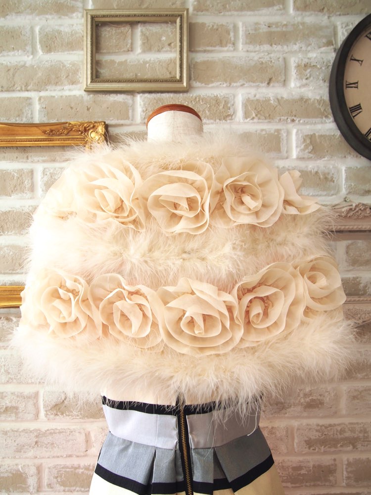 アイボリーのシフォン生地にリアルフェザーをミックスしたショール。前で結ぶのはもちろん、背中側で結ぶとボレロ風の着こなしもできます。柔らかなアイボリーのカラーは落ち着きもあり、上品でフェミニンな雰囲気を与えてくれます。また、大きなお花のデザインも華やかさを盛り上げます。冬場のパーティーなど、華やかなドレスアップスタイルでのお出かけのお供に。