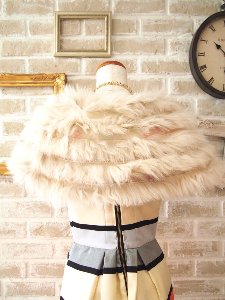 アイボリーのフォックスファーケープ。ドットチュールのリボンを結んでケープとして着用するデザイン。優しい色合いが可愛らしい雰囲気です。段が入ったデザインはコーディネートに表情と深みを持たせ、肌馴染みのいい優しいベージュとチュールのおかげで優しくフェミニンな印象もプラスしてくれます。冬場のパーティーの羽織として華やかなドレスに合わせて、さらにエレガントでゴージャスなコーディネートをお楽しみください。外に出る場面などに一枚あると便利ですね。