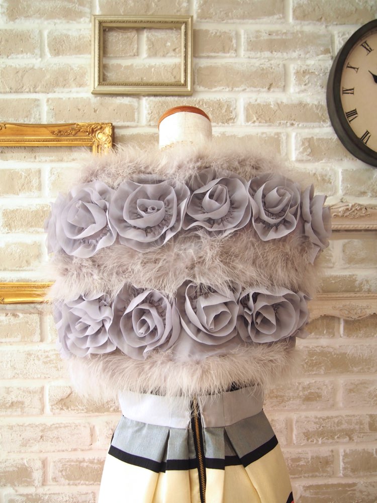 ライトグレーのシフォン生地にリアルフェザーをミックスしたショール。前で結ぶのはもちろん、背中側で結ぶとボレロ風の着こなしもできます。柔らかなライトグレーカラーは落ち着きもあり、上品でフェミニンな雰囲気を与えてくれます。また、大きなお花のデザインも華やかさを盛り上げます。冬場のパーティーなど、華やかなドレスアップスタイルでのお出かけのお供に。