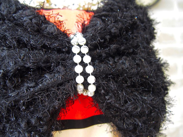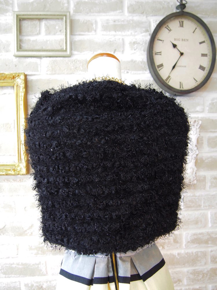 ブラックのプードル生地のような毛糸を使用したケープ。頭から被って着用するリボン型のケープです。体がリボンで覆われるようなインパクトのあるデザインで、フェミニンで可愛らしいイメージに仕上がります。コーディネートのアクセントに。ミニ丈のフレアスカートのドレスに合わせて思いっきりキュートなスタイルも、Iラインのドレスに合わせて上品な甘辛スタイルにも組み合わせていただけます。毛足が短く、10代20代の謝恩会・同窓会やパーティーにぴったりなゴージャスすぎないカジュアルな雰囲気です。