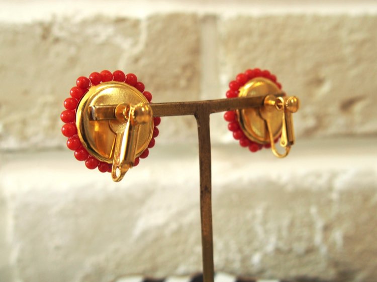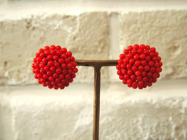 スカーレットカラーが可愛さの中にちょっぴり個性的なイヤリング。パール系のこのようなデザインは最近よく目にしますが、粒々のビーズでこの色味は珍しいですね。とても目を惹くカラーですので2.5センチほどの控えめなサイズながらインパクト大。そして、この丸みを帯びたデザインが女性らしい。パーティーや謝恩会などはもちろん、花嫁さんの2次会にもおススメです。ホワイトのドレスに合わせると、挙式・披露宴とはまた違った2次会らしい、ほんの少しカジュアルダウンしたコーディネートの出来上がりです!2次会では本番と雰囲気を変えたい。と思われている方が多くいらっしゃいます。小物1つで印象がガラッと変えられますので定番スタイルではなく是非、冒険をしてみては?