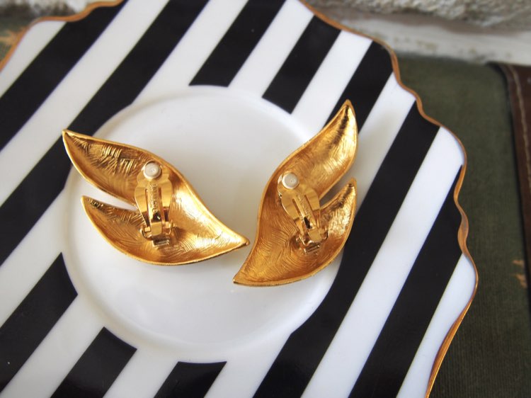 オシャレなセミマット仕様のリーフモチーフゴールドイヤリング。耳たぶが隠れるほどの大ぶりなサイズ感と角度や光の加減によって微かに輝く素材がシャープ&クールでインパクト大。ネックレスを着けなくても充分な存在感を出してくれるのでアップスタイルやタイトなヘアアレンジでカッコよく。パーティーや謝恩会・女子会などにおススメのこちらのイヤリング。結婚式などの定番はパール&ストーンという形なので、特別なマナーもなく、ご自分の好きなスタイルで行ける。そんな日にピッタリ。クールビューティーなパーティードレスやパキッとしたカラーのドレスとの相性も抜群。個性的なデザインがお好きな方に。。