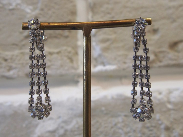 クリアの粒ストーンがびっしりと敷き詰められた3本ラインのドロップ型(雫)シルバーイヤリング。トップと先端に1粒づつ置かれたサイズ違いのストーンがキリッとシャープな印象に。。5㎝弱の比較的長めな作りが細身で華奢なデザインながらゴージャス。動きがあり女性らしさも満載。顔映りの良いシルバーカラーですのでパーティーや謝恩会などにも。ショートカットの方がこのようなタイプのアクセサリーを身に着けていると、とてもインパクトがありカッコいい女性といった雰囲気漂うスタイルで素敵です。クールにもエレガントにも自由自在。お好みのコーディネートを!