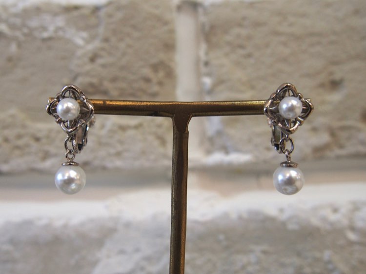 シルバースクエアの台座に小粒パールがポツンと、、フラワーデザインが可愛らしくも上品なイヤリング。下に連なるゆらゆら揺れる大きさ違いのパールが女性らしい目を惹くデザイン。どんなシーンにでも合わせやすく、浮く事のないサイズ感・シルエットが丁度よい迷わず着用頂けるイヤリング。ゴールドカラーよりも明るく映るシルバーカラー存在感も充分です!!年齢層も選ばないシンプルデザイン。結婚式やパーティー・顔合わせなどあらゆるシーンにピッタリです。派手なデザインやあまり大きすぎるアクセサリーが苦手な方におススメです。