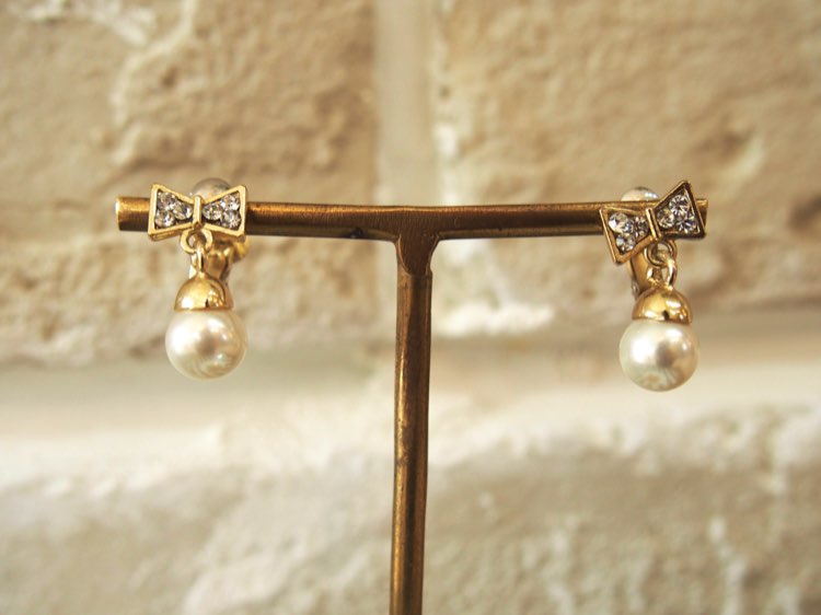 ミニリボンモチーフから連なる小粒パールが可愛いゴールドイヤリング。トップのリボンがストーンで埋め尽くされキラキラと輝きを放ち、とてもキュートで華やかなデザイン。ゴールドカラーは肌なじみの良いカラーで、デザインを強調し過ぎず派手な印象もありません。サイズ的に、どんなネックレスとも相性が良くコーディネートも迷わず安心です!また、真っ白なパールが小ぶりながらも存在感を出してくれるので、その日のコーディネートを華やかに演出してくれます。謝恩会・女子会のパーティースタイルや結婚式でのワンピースドレス等どんなシーンにでも合わせやすく幅広く活躍してくれるそんなイヤリングです。