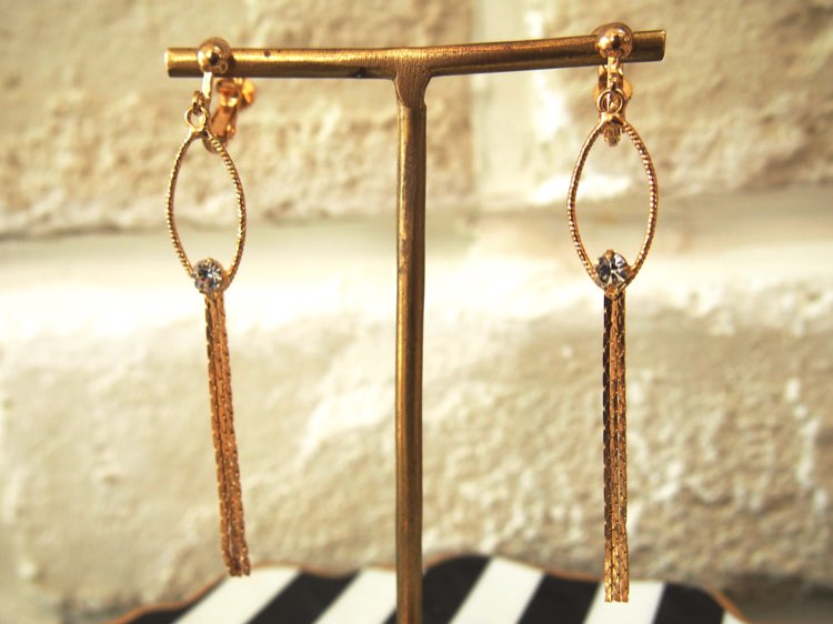 オーバルフレームから流れるように連なったフリンジがシンプルで落ち着いた印象のゴールドイヤリング。中央に施された粒ストーンがキラリと程よく輝きます。7㎝程のロングタイプですが派手なデザインではなく縦ラインが女性らしく華奢な作りとなっております。ゴールドカラーは肌馴染みも良く美しく見せてくれるのも嬉しい限りですね!ゴージャスすぎるのは苦手だけど、ナチュラルな華やかさは欲しい、そんな大人の女性。。におススメです。揺れるデザインはとても人気です。結婚式やパーティーなど様々なシーンでお使い頂けるイヤリングです。