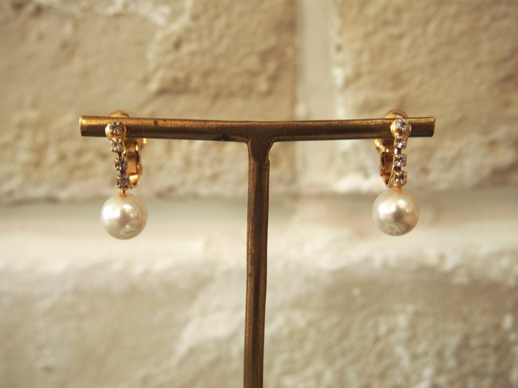 定番デザイン!!ストーン&パールのシンプルゴールドイヤリング。皆さんも必ず1度は目にしたことのあるタイプだと思います。定番だからこそ良いこと尽くし。まずは、様々なシーンで活躍。結婚式・顔合わせ・イヴニングパーティー・謝恩会などなど。ドレスや、ヘアスタイルも選ばず全てにフィットしてくれます。。そして何より、シンプルなデザインはネックレスや他の小物次第で自由自在に、また無限にコーディネートを楽しめます。そんな万能で間違いないこちらのイヤリングでナチュラル~ノーブルスタイル、その日の気分やお客様好みのスタイリングを。。是非!