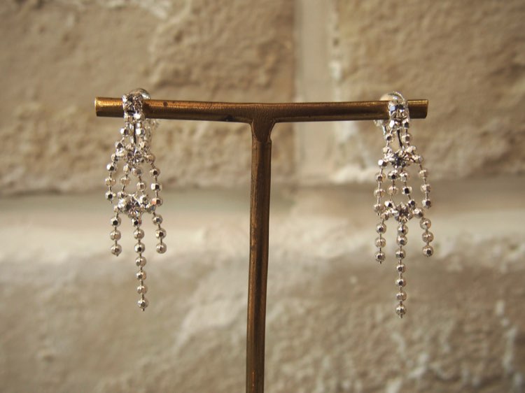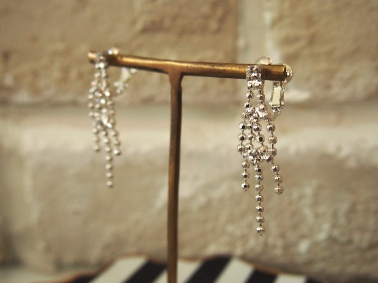 控えめな輝きを放つボールチェーンと粒ストーンのシルバーイヤリング。ロングタイプですが細身のラインで流れるように連なるボールチェーンは一切の派手さがなく華奢な作り。合わせてゆらゆらと揺れるデザインは目を惹き程よい華やかさを演出してくれます!とても女性らしく上品な印象。ご利用頂けるシーンも幅広く、結婚式~華やかなパーティーまで様々な場面にフィット。ショートヘアの方や、ロングヘアの方はアップのアレンジなどスッキリしたスタイルに合わせるとスタイリッシュに決まり素敵です。シルバーカラーは顔映りも良く明るく見せてくれるのも嬉しいですね!