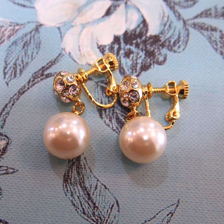 ゴールドチャームから連なる中玉のパールが丸くコロンとしたデザインで、なんとも柔らかく優しい印象。ゴールドチャームにはドット模様のように散りばめられた立体的なクリアストーンが正面・横からどの角度から見ても綺麗な輝きを放ってくれます。パールの上品さも加わりとても女性的で程よい華やかさ。こちらの商品はご予約いただくお客様の年齢層も幅広く、また結婚式やパティ―・女子会など対応シーンも幅広く、コーディネートに取り入れやすく迷わないデザイン。ボリュームあるネックレスとのスタイリングで豪華に、、も素敵です。その日のスタイルに似合わせてくれる。そんな万能イヤリングです。