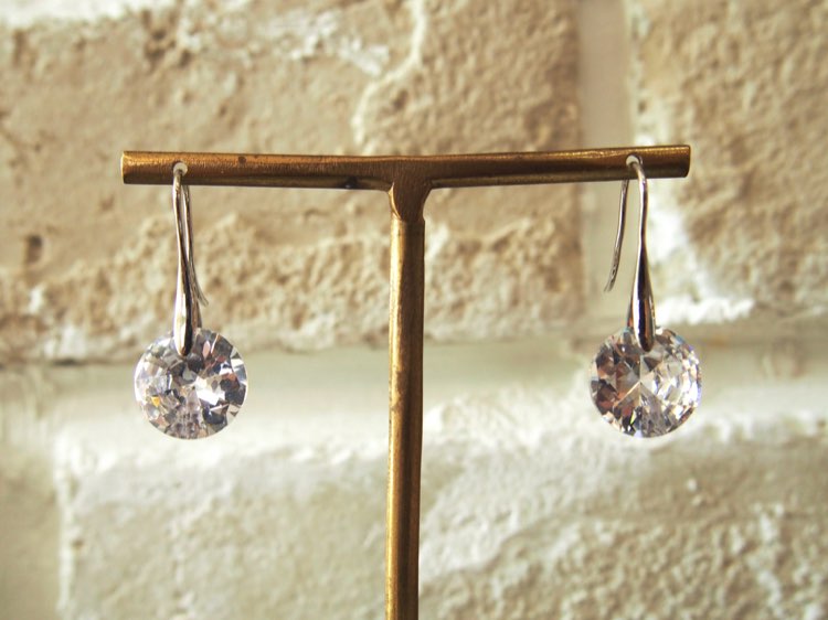 1㎝以上の大きめなクリアストーンが存在感抜群のシルバーピアス。デザイン的にはとてもシンプルでどちらかと言うと定番なイメージでもありますが、若干の重みすら感じる1粒のストーンには細かなカッティングが無数に入っており最大限の輝きを放ち豪華さ・華やかさも演出してくれます。新婦様の2次会用~ゲスト・パーティーまで様々なシーンで多くご使用いただいております。パールの入ったネックレスなどと合わせると華やかさと上品さがプラスされワンランク上の豪華なスタイリングをお楽しみいただけます。フックタイプですので着脱も簡単です。