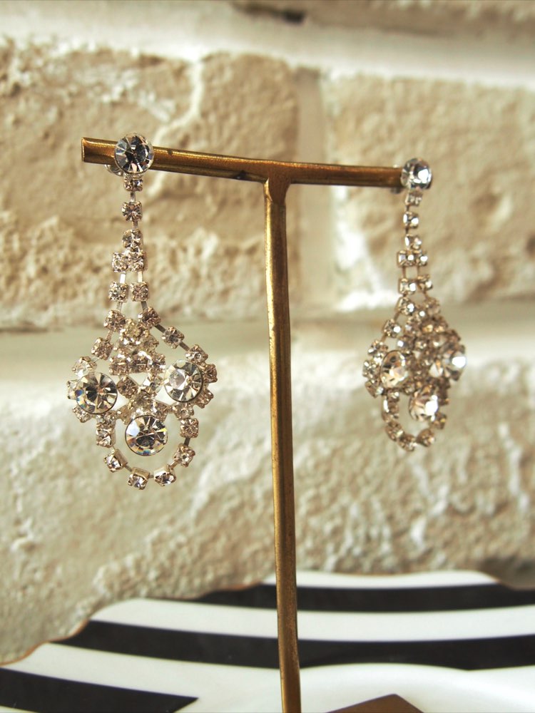 大小ミックスのストーンがキラキラと輝くシルバーピアス。シャンデリアのような豪華で華やかなデザイン。動く度に揺れる様子が目を惹き主役感満載。新婦様の披露宴・2次会用として多くご使用頂いております。もちろん、イヴニングパーティーなどの華やかなシーンにもピッタリ。オールストーン仕様でカッコ良さもプラスされ、ロングドレスに合わせると一気にラグジュアリーなパーティースタイルに大変身です!比較的ボリュームのあるタイプですのでアップやタイトなヘアスタイルでスッキリスタイリッシュに決めてみてはいかがでしょうか?