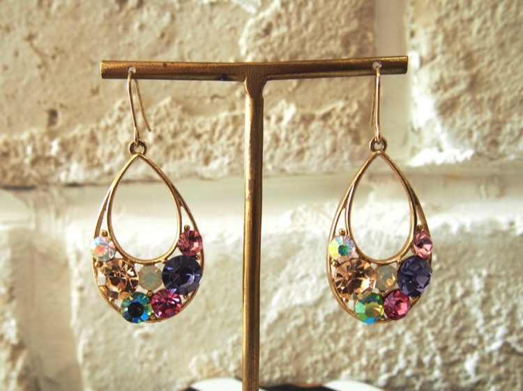 ティアドロップ型ゴールドピアス。サイズ違いのカラフルなストーンがびっしり詰まった光輝くデザイン。全色柔らかめなカラーストーンとなっております。ゆらゆらと揺れる度に輝く様子はとても華やかでポップな印象。気持ちまで明るくなりそう、そんな元気ピアス!耳元のワンポイントコーデで、オールブラック・オールホワイトなどの単色スタイルにこちらのピアスを投入。やり過ぎない感じがバランス良くスタイリッシュに決まります。謝恩会や女子会などのシーンで他と被らないコーディネートが注目の的!!ですね。フックタイプとなっておりますので着脱もらくちんです。