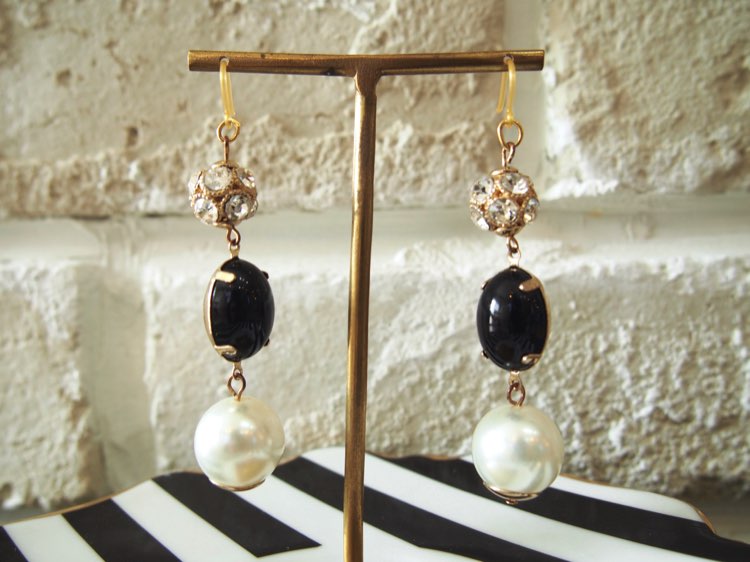 キラキラと輝くゴールドのストーンボールをトップにブラック~ホワイトパールと3つ連なったロングデザインはとてもインパクトがあり存在感抜群。華やかさはありますが、・ゴージャスな美しさ・というよりは遊び心のあるカジュアル寄りのデザインとなっております。花嫁さんの二次会でホワイトドレスに合わせるとお洒落感が増し披露宴とはまた違った雰囲気を楽しめそう。もちろんゲスト用としてもご友人の結婚式や謝恩会などで目を惹く事間違いなしです。こちらのピアス1点でも充分なボリュームですのでTPO、その日のスタイルに合ったコーディネートを。。シリコンフックとなっており着脱も簡単!金属アレルギーの方も安心して着用頂けます。