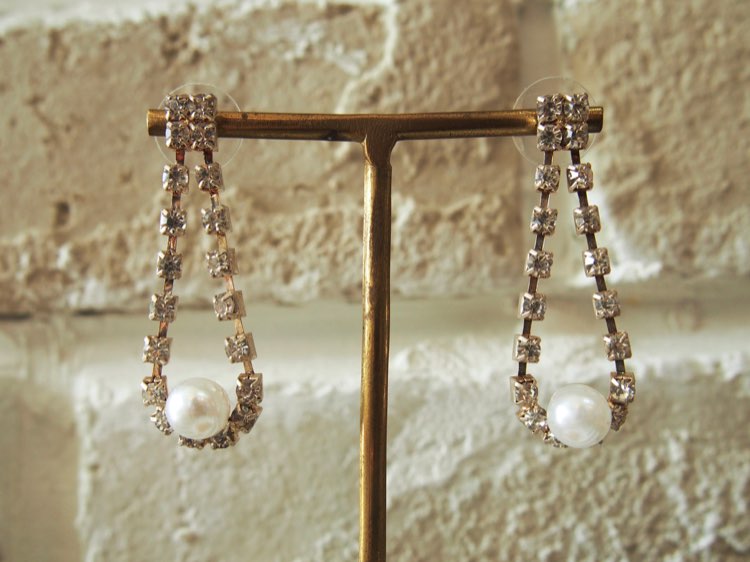 シルバードロップ型(雫)ピアス。小さなストーンがゆらゆら揺れる流れるようなカーブに沿ってキラキラと輝きます。先端の1粒パールが更に上品さを増し、重みのある華やかなデザイン。ある程度、存在感のある大きさですがドロップ型の中心部分が空洞になっていることで、派手な印象はなく、女性らしく着用頂けます。王道なデザインですのでコーディネートもしやすく、豪華なパーティードレスやナチュラルなワンピース、どんなスタイルにでもお楽しみいただけます!結婚式やパーティーなど場を選ばず大活躍してくれそう。普段、あまりピアスを着けない方、派手なアクセサリーが苦手な方にもおススメです。