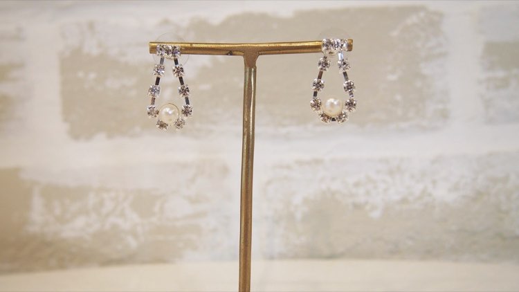 シルバードロップ型(雫)ピアス。ストーンが流れるような揺れるカーブに沿ってキラキラと輝きます。先端に施された小さな1粒パールが控えめな華やかさ上品さをプラス。とても洗練されたデザイン。小ぶりなサイズ感と中心部分が空洞になっていることで、派手な印象はなく、女性らしく着用頂けます。シンプルなデザインですのでコーディネートもしやすく、豪華なパーティードレスやナチュラルなワンピースなど幅広いコーディネートをお楽しみいただけます!結婚式やパーティーなど場を選ばず大活躍してくれそう。普段、あまりピアスを着けない方、派手なアクセサリーが苦手な方にもおススメの商品です。