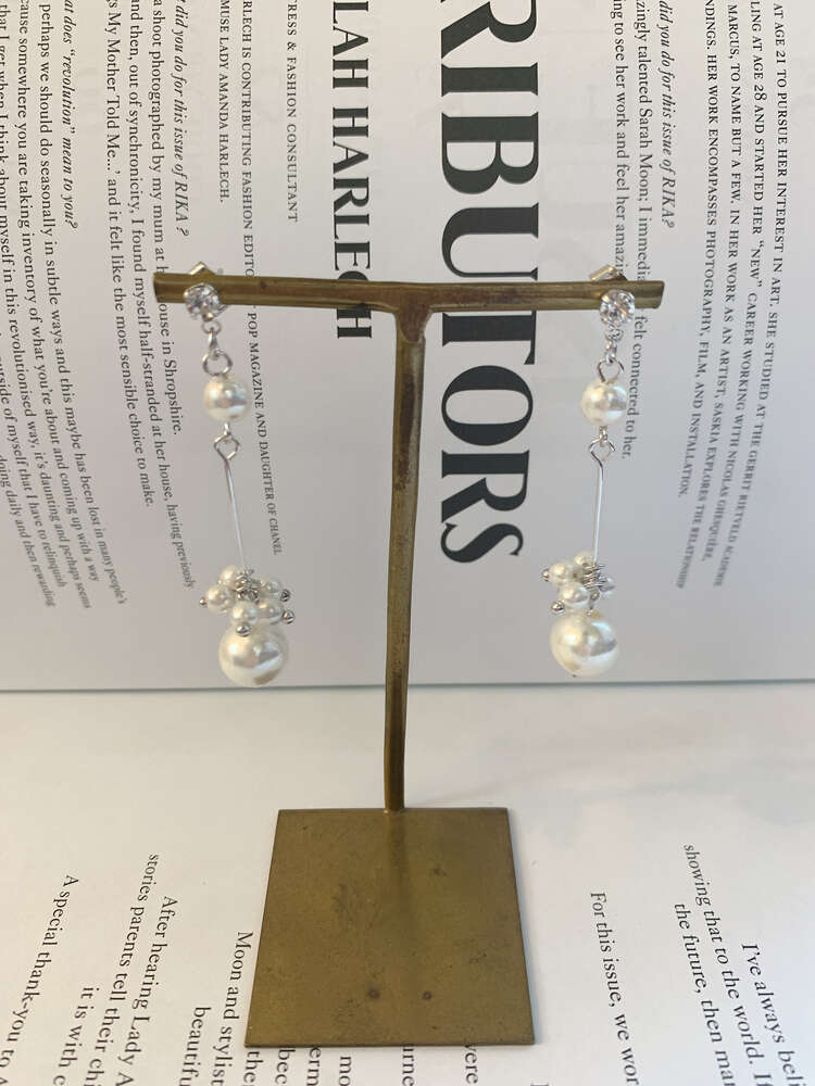 トップの1粒ストーンからホワイトパール・ストレートバーと全てが華奢でとても女性らしいピアス。先端に施された大小ミックスのパールが華やかさを演出してくれます。シルバーカラーにパールのホワイトが引き立ち優しくピュアな雰囲気に。ゆらゆらと揺れる縦ラインが美しく映り目を惹きます。こちらのピアスは幅広いシーンで着用頂けます。主役の新婦様やパーティー・女子会・顔合わせまで。華やかスタイル、上品スタイル全てに似合わせてくれる万能ピアスです。ロングタイプですが派手な印象はなくお祝いの席にも安心!ナチュラルなヘアスタイルでふんわり柔らかコーデ、おススメです。