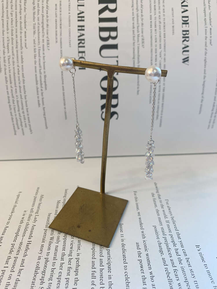 ダイヤモンドのようなクリアビーズが先端に連なる優しい印象のシルバーピアス。揺れるビーズはキャッチ部分に付いておりますのでキャッチを変えると1粒のパールピアスに変身。縦ラインの細身シルエットがとても女性的で清楚な雰囲気に。主役である新婦様の純白ドレスにもピッタリなデザインです。もちろん派手過ぎないナチュラルな輝きがゲスト・パーティー・女子会など全てのシーンで活躍してくれそう。ホワイトパールとシルバーカラーの組み合わせは顔映りも良く美しく見せてくれます。年齢も選ばないこちらのピアス、タイトにまとめたヘアスタイルやアップスタイルで上品な清楚系コーディネートを!