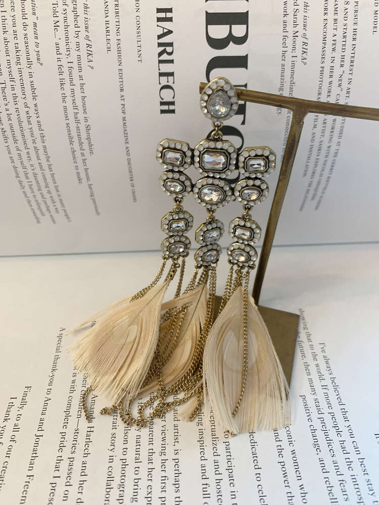 当店でも数少ない片耳用ピアス。レトロな雰囲気にもエスニックにも見えるデザイン。シャンデリアビジューにビッグフェザーがインパクト大。片耳だけ着けることによってとっても個性的に映ります。輝くビジューの華やかさも加わりどんな大きなピアスよりも目を惹きそう。片方だけタイトにまとめたヘアスタイルに合わせると一気にオシャレ女子の完成ですね!かなり大きめの作りとなっておりますのでパーティーシーンにおススメ。縛りのない自由スタイルの場にいかがでしょうか?スタイリッシュなドレスとの相性抜群。他アクセサリーを全て省きこちらのピアス1点着けでカッコ良いスタイルに。。