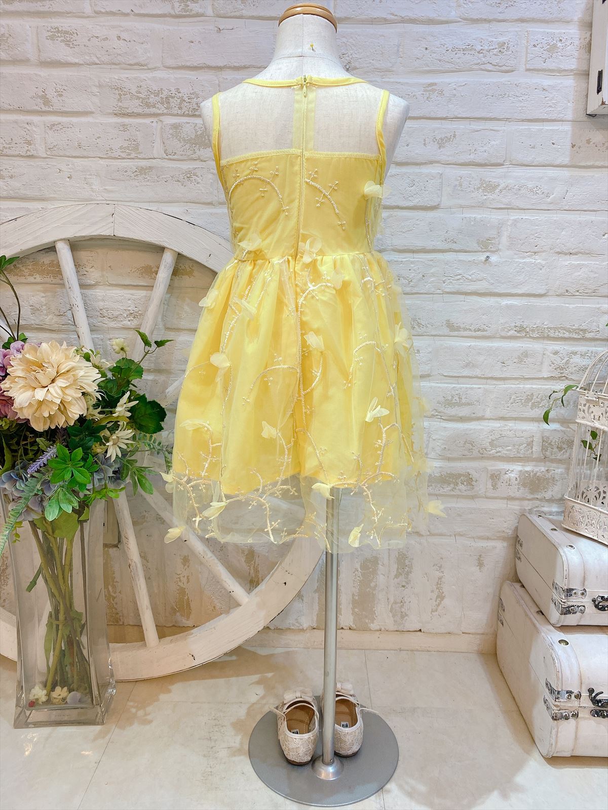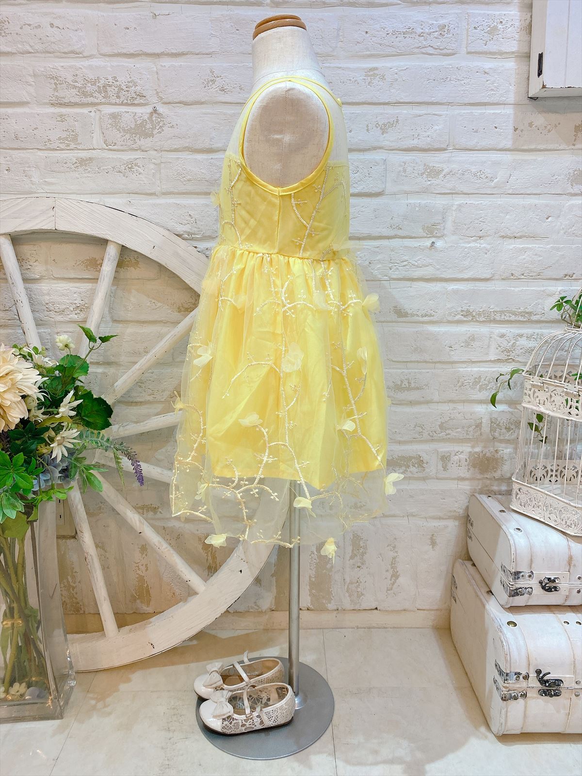 ひまわりイエローカラーキッズドレス。全体的なチュールとお花がとってもキュートで可愛いキッズドレス。ピアノの発表会等のステージ衣装にもぴったりです。その他パーティーや結婚式のお呼ばれ、様々なシーンでご利用頂ける可愛らしいワンピースドレスです♪