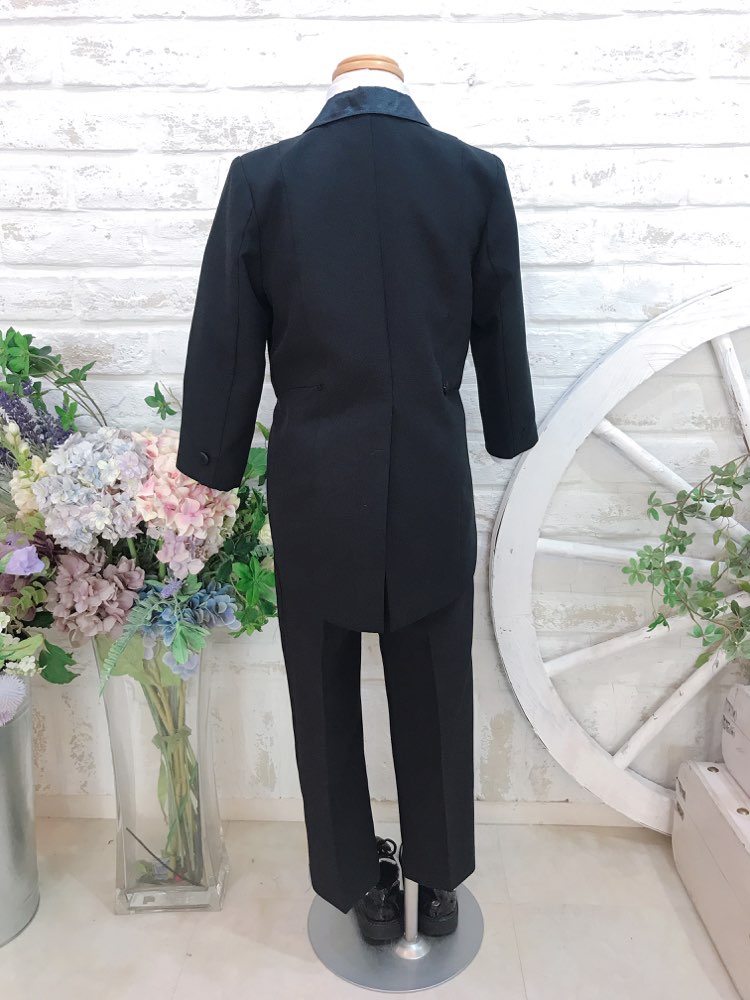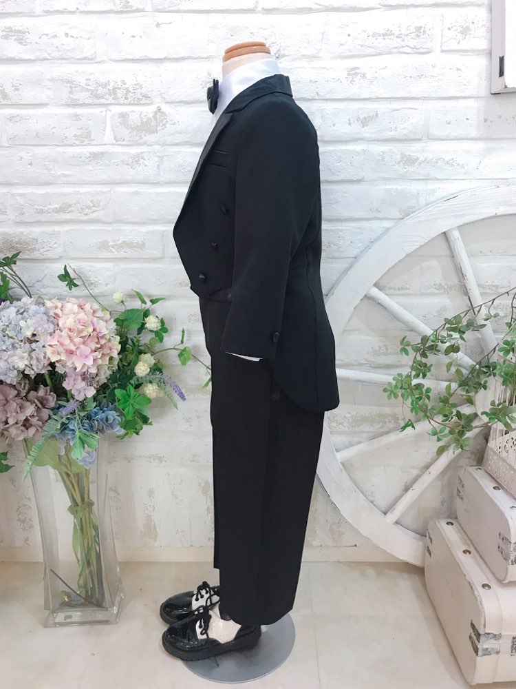 男の子用のブラック燕尾服。蝶ネクタイも全てブラックでかっこいい印象。フォーマルにふさわしい、キッズ燕尾服。ジャケットにはくるみボタン、パンツウェストは背中側がゴム仕上げなので、ゆったり着れます。サテン生地のカマーバンドも付いて、フォーマルデビューには定番の燕尾服がおすすめです♪パンツにはファスナー、ポケット付き。ハンカチも入れられます。カマーバンドの後ろはゴムでマジックテープで止める形です。結婚式、リングボーイ、七五三、前撮り撮影で、様々なシーンでご利用頂けます。