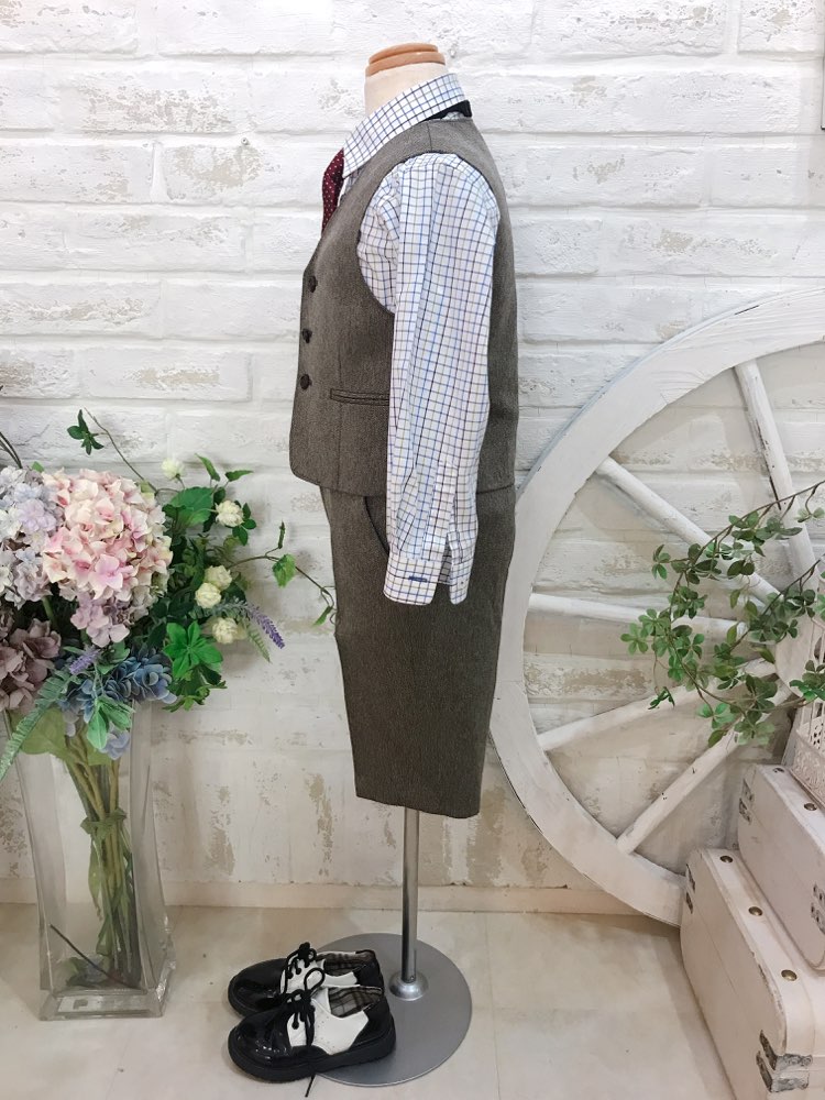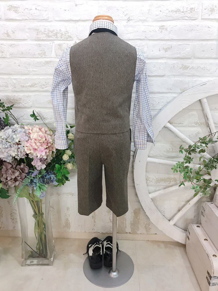 ブラウンのツイード素材のベストとパンツのキッズタキシード。パンツはハーフパンツ丈になっております。同じ素材のベストとパンツは上品な印象なので、結婚式やパーティー、七五三、お祝い事の写真撮影など様々なシーンでご利用頂けます。チェックのシャツと赤いネクタイがセットになっていて、合わせて着るとより一層おしゃれな着こなしになります♪ネクタイの首周りはゴムになってます。パンツ内側にゴムが付いていてサイズ調整可能。