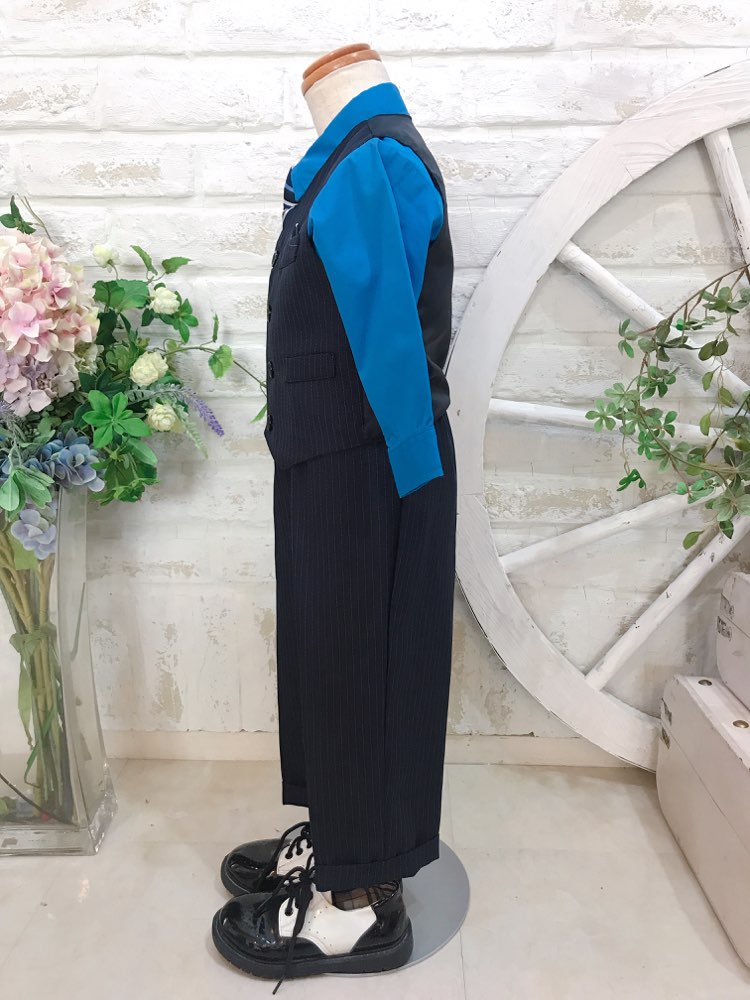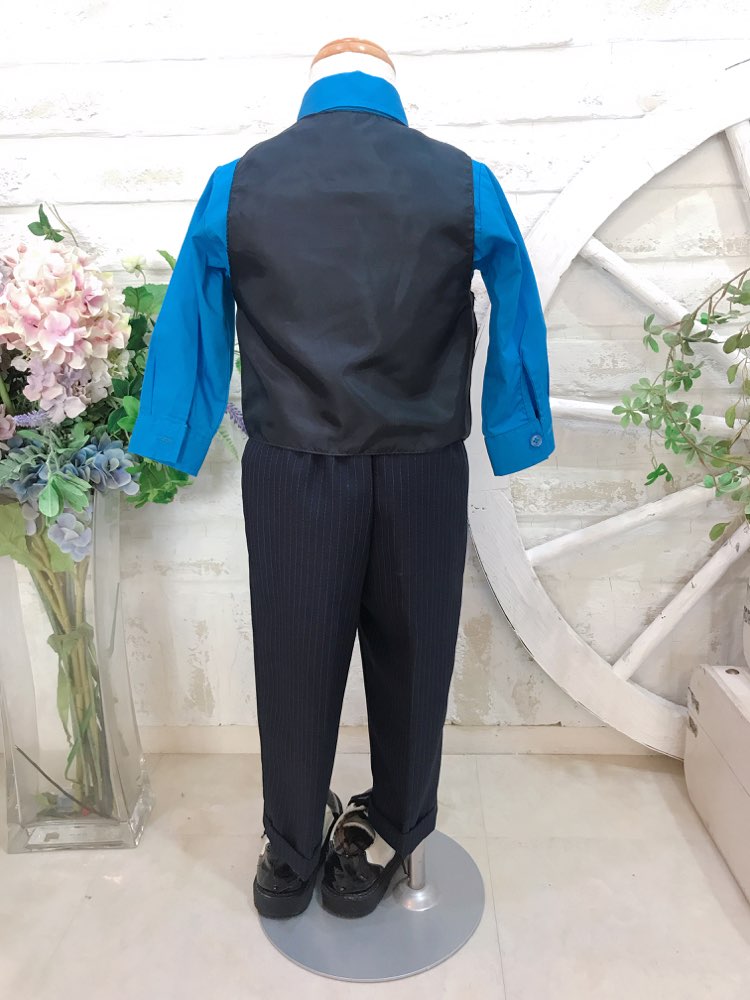 真っ青なシャツにブラックの上下のベスト&パンツにブルーのネクタイと同じ柄のチーフがアクセントのキッズタキシード。ベストとパンツには薄っすらと白いラインがストライプで入っていて、すっきりとした大人っぽい印象に♪パンツは100%ポリエステルなので走り回ったりして汗をかくお子様でもサラッと着て頂けます♪ウェストは一周ゴムになっているので着心地抜群!ネクタイはシャツに挟むだけなので装着簡単です。チーフも縫い付けているので落とす心配もなし♪結婚式、リングボーイ、ピアノや音楽発表会、七五三や写真撮影等にもおすすめです。