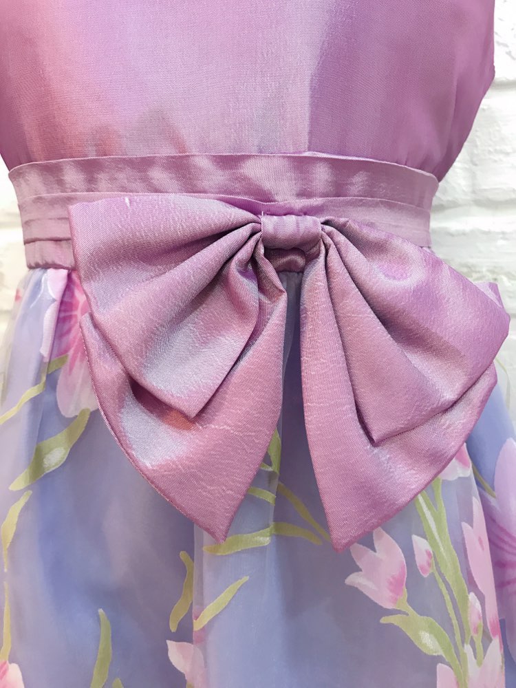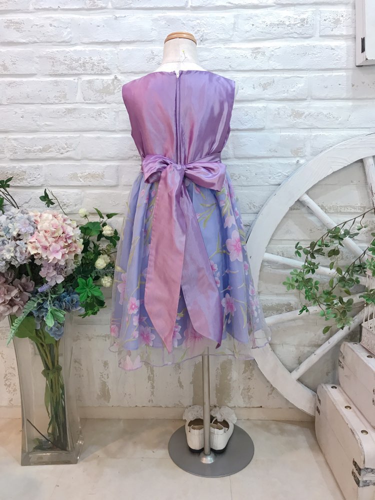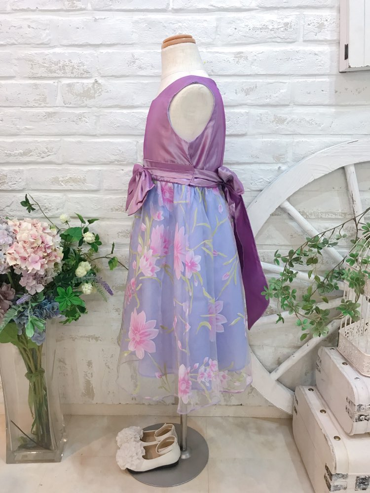 華やかなパープル花柄キッズドレス。スカート部分のピンクのプリント花柄はとってもキュート♪ウェストに立体的リボンが付いていて、可愛さ倍層♪また、後ろでもリボンを結ぶとバックスタイルも可愛い事間違いなし♪スカートは軽い素材でスッキリ♪ピアノやヴァイオリンの発表会・演奏会・コンクール、結婚式のおよばれ、フラワーガール・リングガールの衣装、七五三やお誕生日の写真撮影、パーティーどのシーンにもぴったりの1着です。