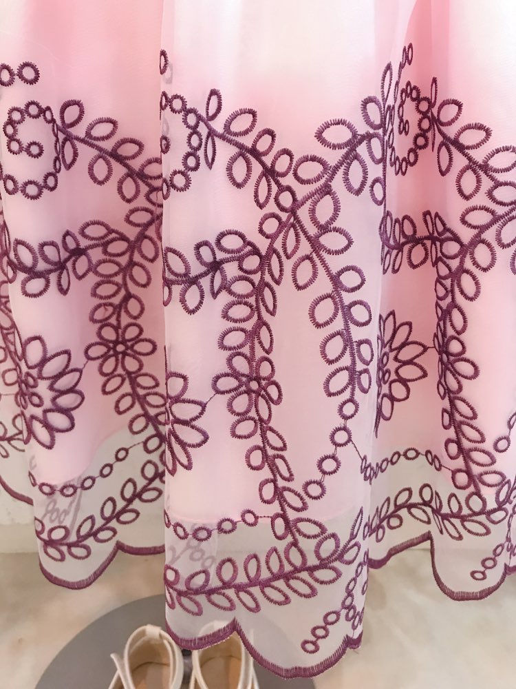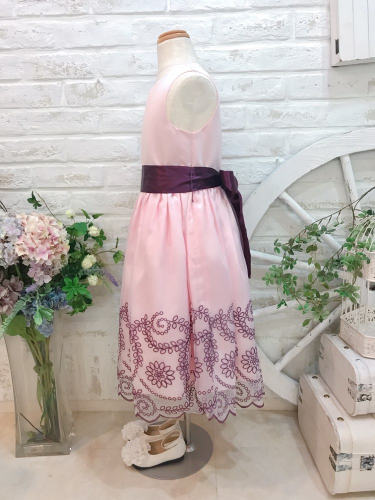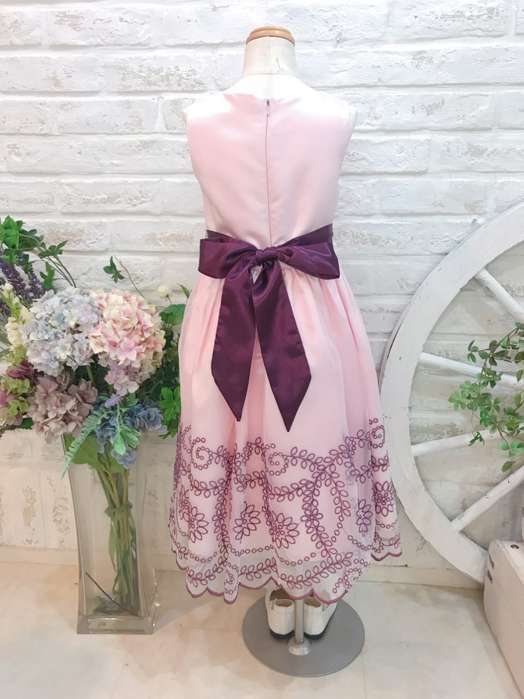 裾の繊細なレース刺繍が魅力的なキッズドレス。淡いパステルピンクカラーの生地に濃い目のパープルの刺?、同じカラーのウェストリボンはとっても可愛い事間違いなし♪大人っぽい色合いで、ちょっぴりお姉さんにおすすめのドレスです。ピアノの発表会やお食事会、結婚式などフォーマルな場面におすすめの1着です。